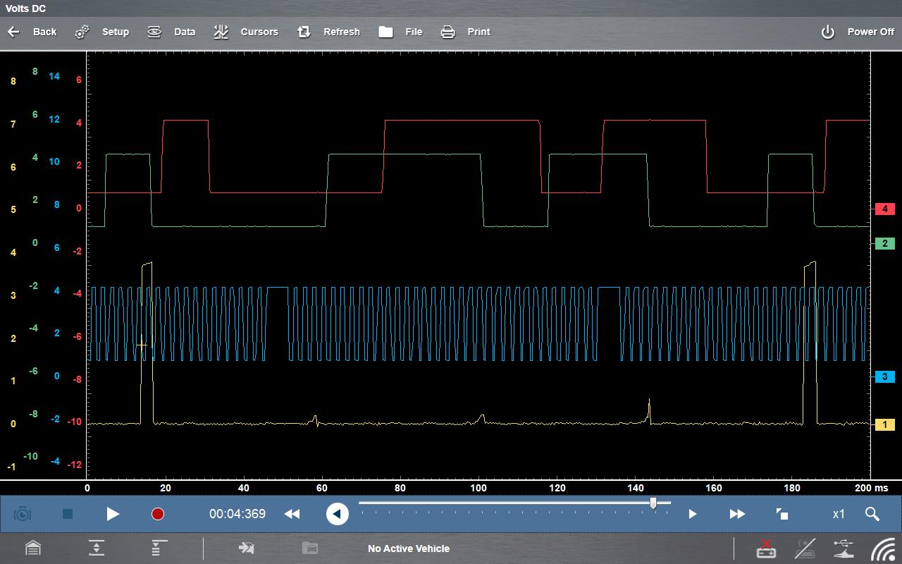 From the waveform above we can see the Variable Valve Timing solenoid valve has a low duty cycle, approximately 10% actuation. It must be noted that the solenoid valve has a constant ground and is controlled on the positive side.