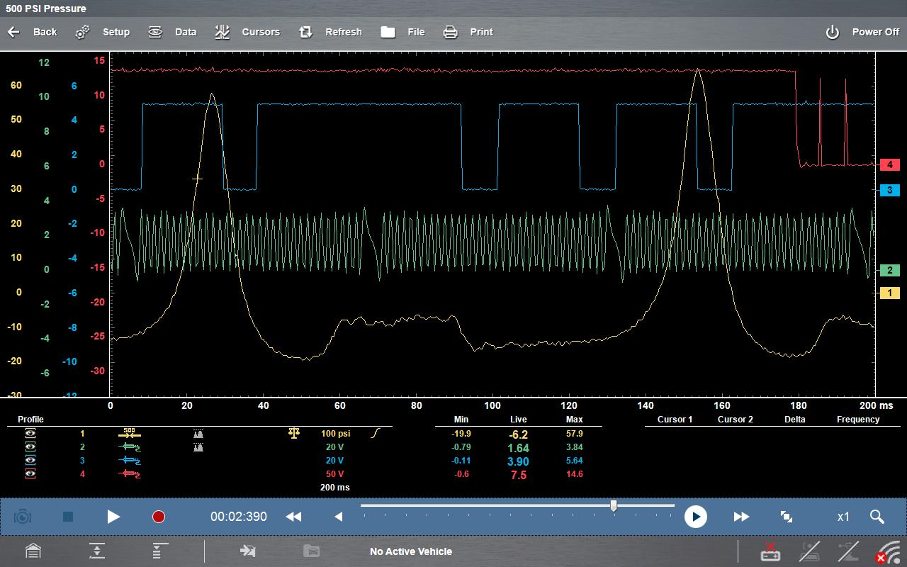 A pressure transducer can be used to analyze the in-cylinder conditions with the engine running. This test can be used to inspect the valve timing as well as detecting issues with cylinder sealing. Image 4 shows the expecting waveform with the engine idling.