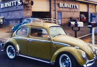 Vintage photo of an older Volkswagen Beetle® in front of Terry Burnett's shop (left). Terry Burnett, Josh's father, with his new toolbox.