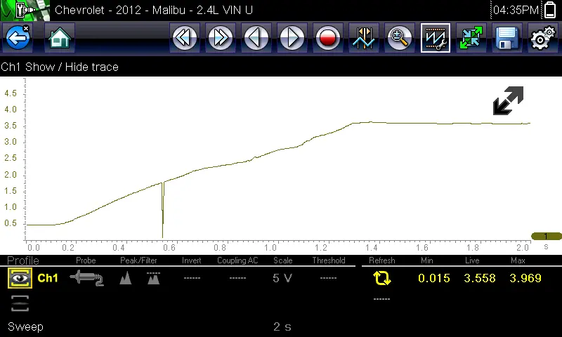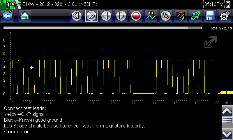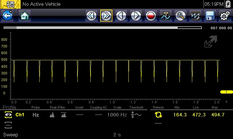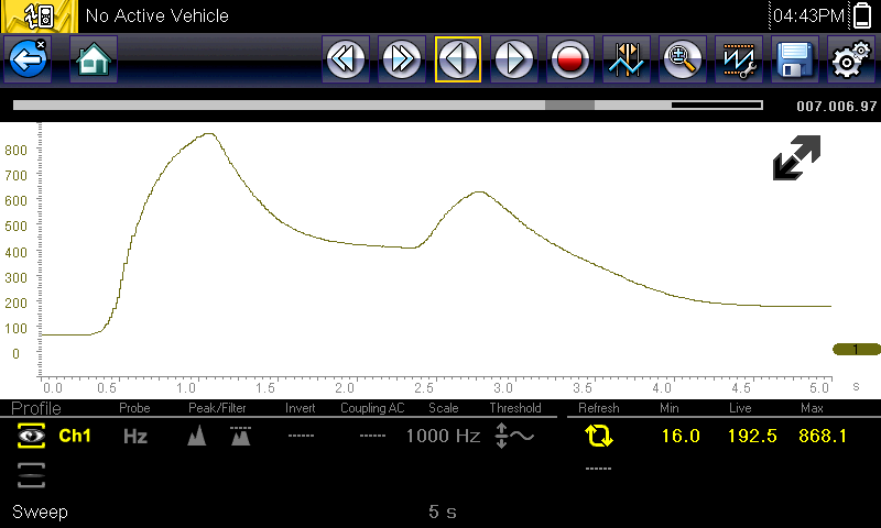 BatteryRemovable, Rechargeable, Lithium-ion batteryBattery Voltage7.4 voltsBoot up SpeedLess than 10 second boot upDimension: Width12.5 inchesDimension: Height6.5 inches (165 mm)Dimension: Depth2 inches (51 mm)Display: Resolution800x480 pixelDisplay: Size8 inchDisplay: TypeResistive, daylight-readable LCD touchscreen, colorExtended Warranty Option1-3 yearsLab Scope / Meter2-channelBandwidth 3MHzSample Rate: Up to 6 million samples/secScale range 0-100mV to 0-400VSweep rate 1 second to 5 minutesSweep rate 50 microseconds to 20 seconds (5 min in GMM mode)Live Data GraphingSelective display of 1, 2 or 4 graphsNavigation4-way keypadTouchscreenOperating SystemEmbedded SMX®USB PortPC connectivityVehicle Systems100+ OEM-specific vehicle systemsWarranty1 yearWeight (incl. battery)3.2 pounds (1.5 kg)