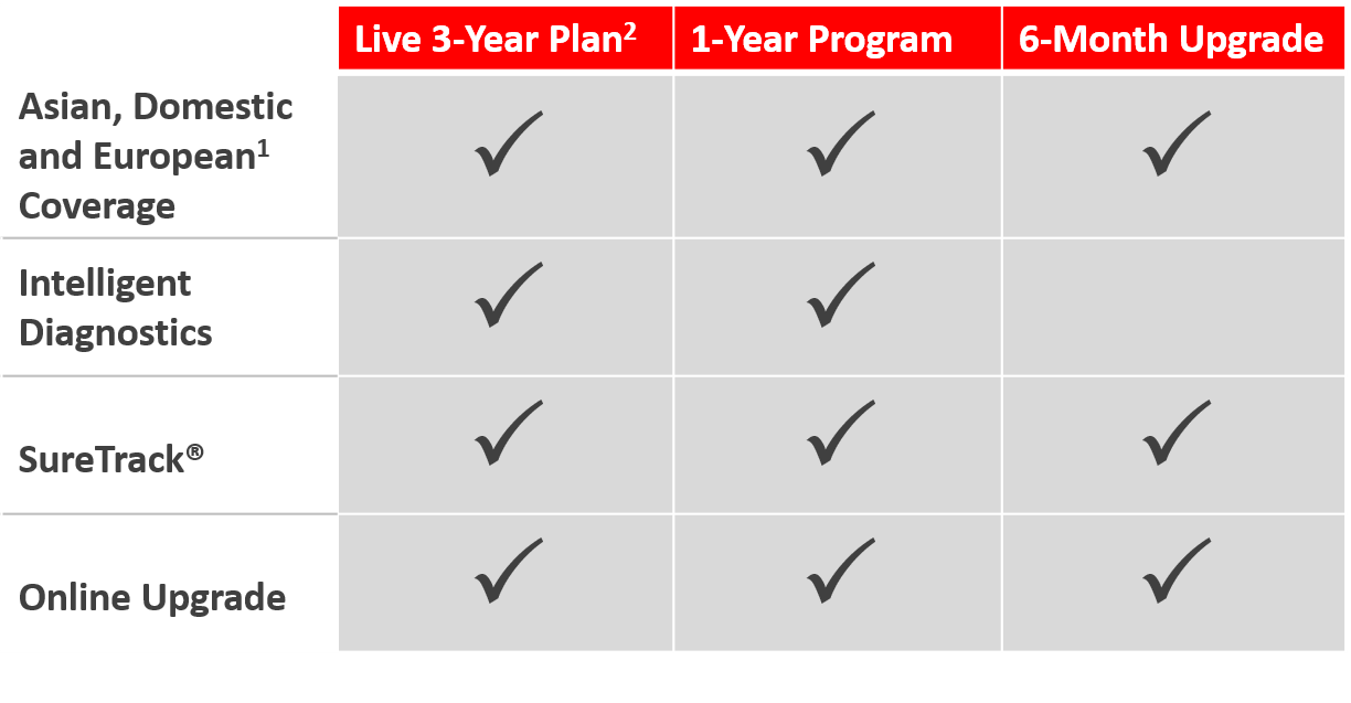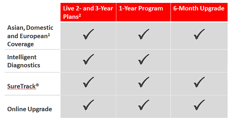 Continuous software upgrades supply domestic, Asian and optional European coverage, plus SureTrack and online software upgrades. Fast-Track Intelligent Diagnostics-enabled products receive complete data services