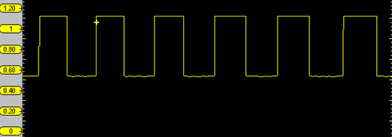 The red trace displays the output voltage: 0.5 Volts to 1.1 Volts. The yellow trace displays current flow: 9 mA to 17 mA. N.B. use the conversion of 10 mV is equal to 1 mA.