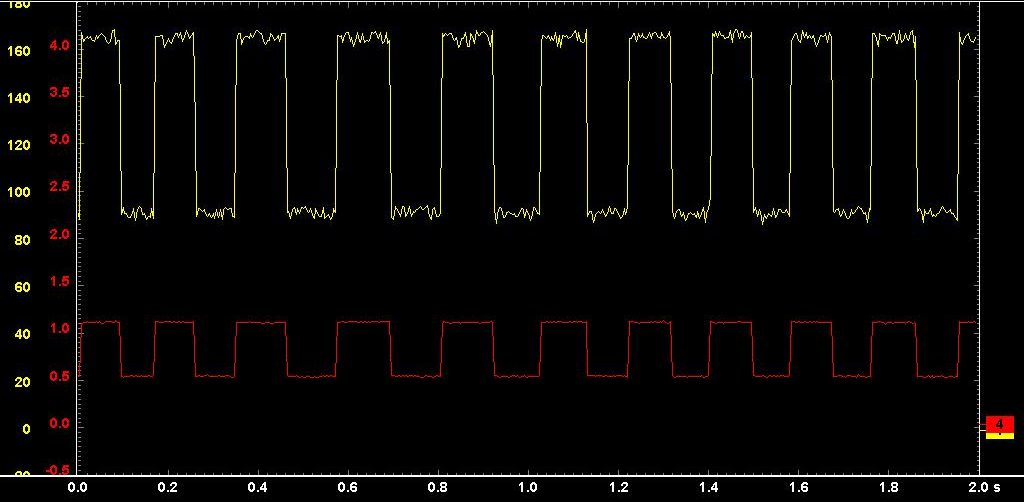 Zoom in on the results and use the cursors to check the measurements during the actuation periods – these should be shown by the two lines rising in time with when the pedal was pressed.