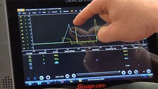With a Snap-on scan tool hooked up to the vehicle, we can see how the data looks on a lab scope and how the pattern is actually different than a standard fuel injector.