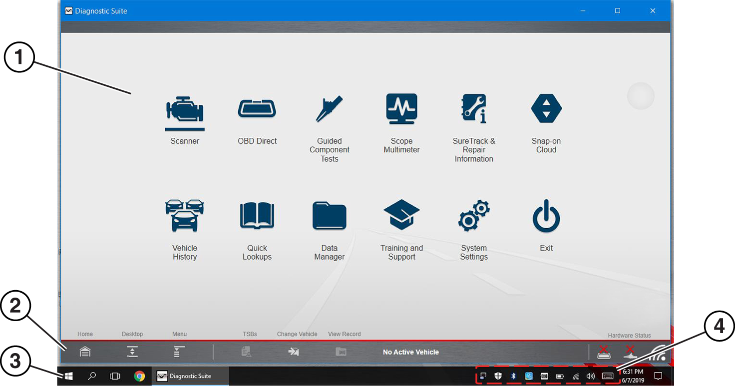 The Home Screen Icons configure the diagnostic tool for the type of test to be performed. The following table gives brief descriptions of the available icons, which operations are available depends upon the individual configuration of your system. Use the stylus or your finger tip to select from the icons.