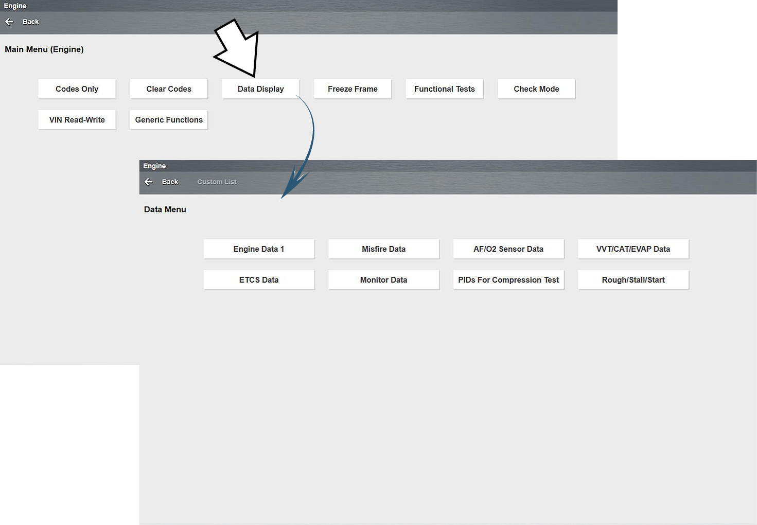 module. The Data display is typically opened from the Vehicle Systems Test/Function menu, see Selecting a Vehicle System Test/Function. The descriptive name may vary (e.g. Data, Data Display, Data Menu, Data Only, or other similar).