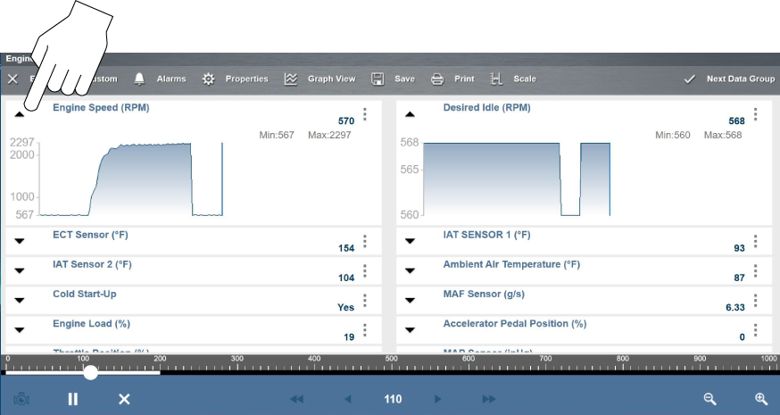 To view a single PID graph in full screen, select the PID Expand/Collapse icon to open the PID in graph display, then select Graph View from the toolbar, or select the Menu icon