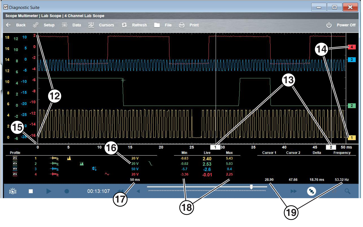 — Turning peak detect “on” may capture unwanted noise, therefore, using peak detect may not be suitable for some tests (e.g. oxygen (O2) sensor), as the waveform may be more difficult to evaluate due to the additional noise that may be displayed.