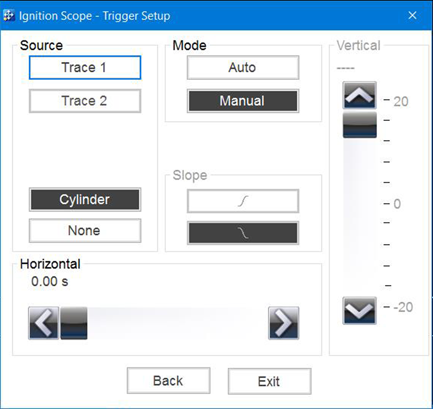 The sensitivity adjustment is primarily used to fine tune the ignition signal into a viewable pattern. The “Vertical” slider is used to raise or lower the cylinder firing detection sensitivity. Adjusting the sensitivity can be useful when: