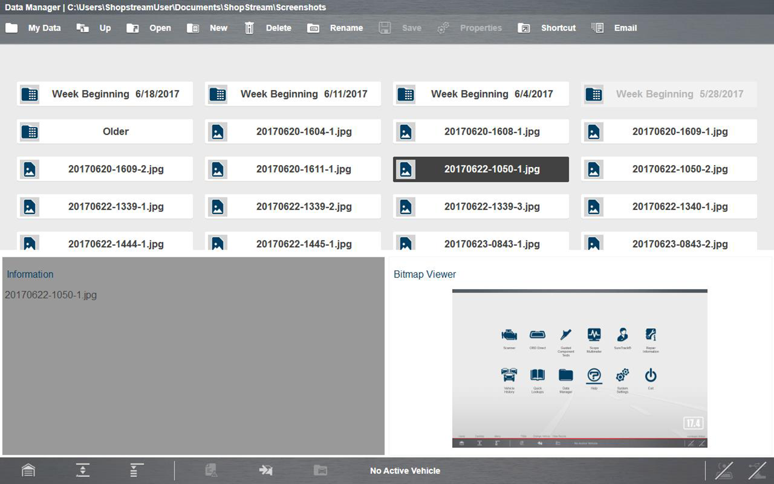 Data Files - data type files (e.g. Scanner, Scope/Multimeter, Guided Component Tests) are saved using proprietary file extensions. To view these types of files, open them through the Data Manager folders panel. Each file type opens within a built-in proprietary viewer.