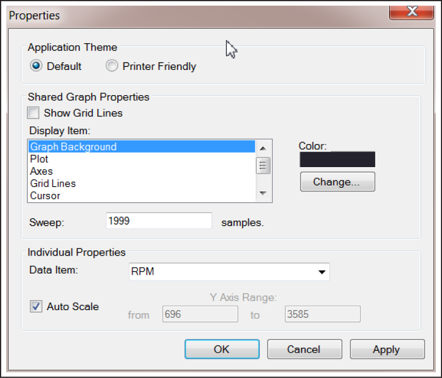 The Tools menu opens the Properties dialog box which has two sections ; Shared Graph Properties and Individual Properties. Shared Graph Properties apply to all graphs, and Individual Properties apply to the selected graph only.
