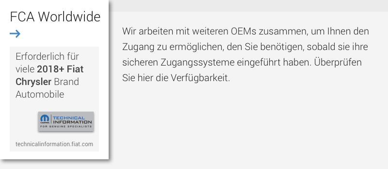 Snap-on arbeitet mit OEMs zusammen, um Ihnen Zugriff auf deren sichere Zugangssysteme zu ermöglichen. Unser Scan-Tool ist derzeit kompatibel mit: FIAT® Chrysler® Automobiles (Stellantis -FCA) Renault & Dacia® Ford® Nissan® Volkswagen® Audi® Konzern Mercedes-Benz®